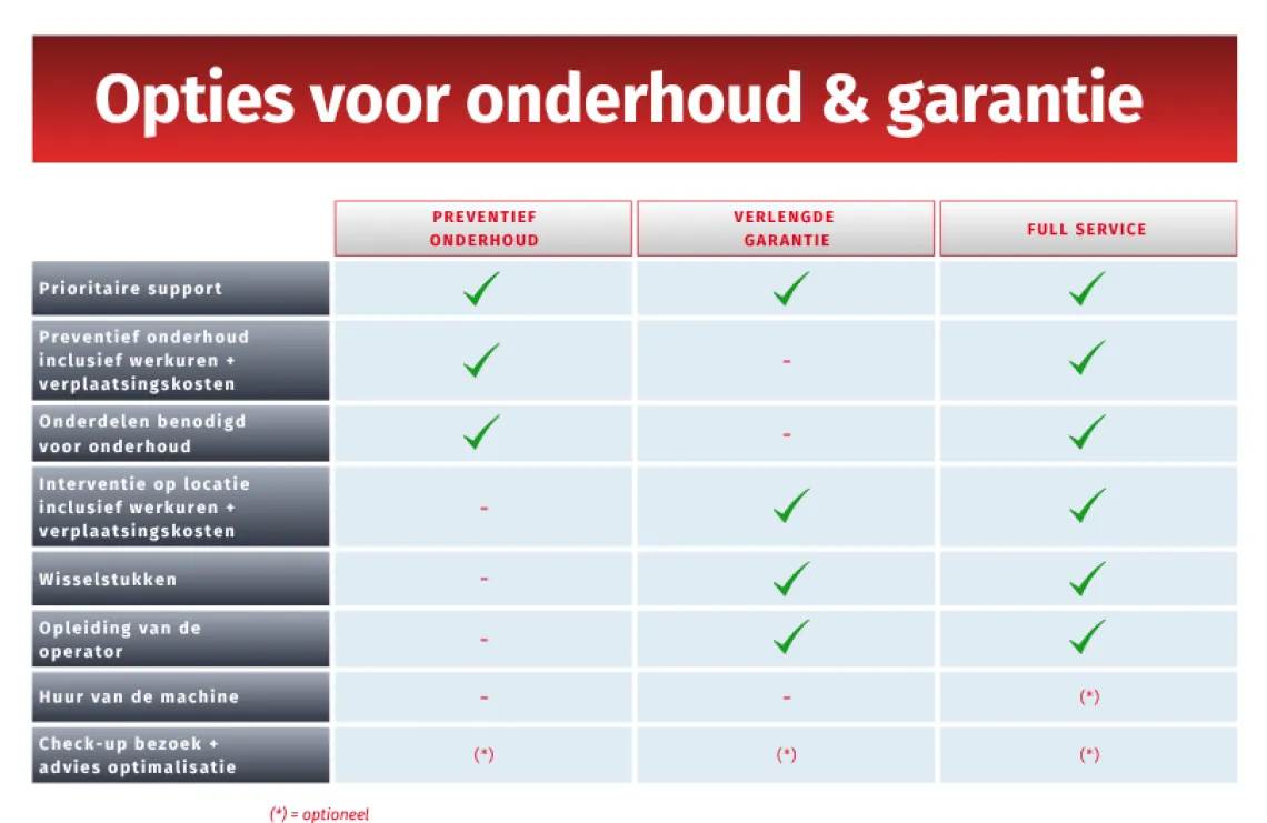 Met een onderhoudscontract van Presa verkleint u het risico op stilstand en behoudt u controle over uw kosten. U bepaalt zelf welke machines opgenomen worden, van één toestel tot uw volledige machinepark.